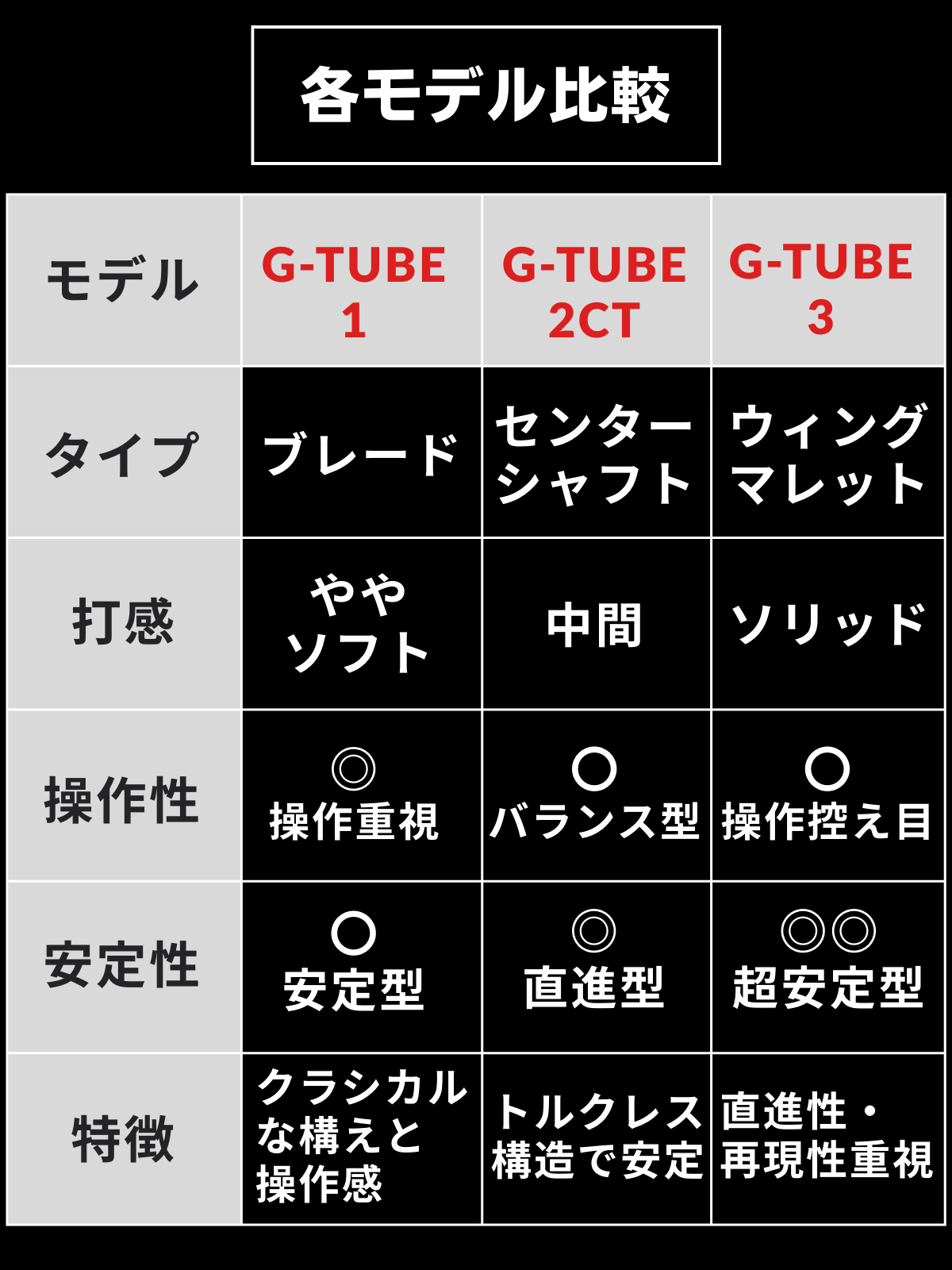 この理念を形にするために、G-TUBEシリーズでは3種類のモデルを用意し、それぞれのモデルごとに異なる素材と重心設計を採用しています。